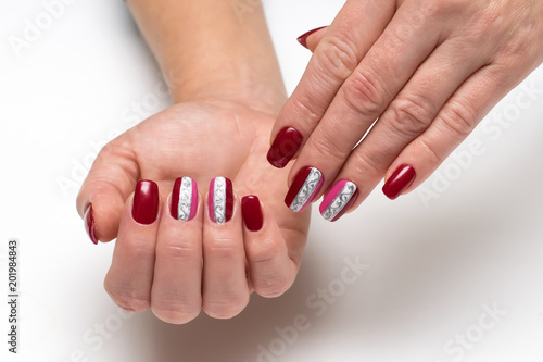 Festive Burgundy Red Pink Manicure With Convex Silver Monograms On Long Square Nails On A White Background Stock Photo Adobe Stock